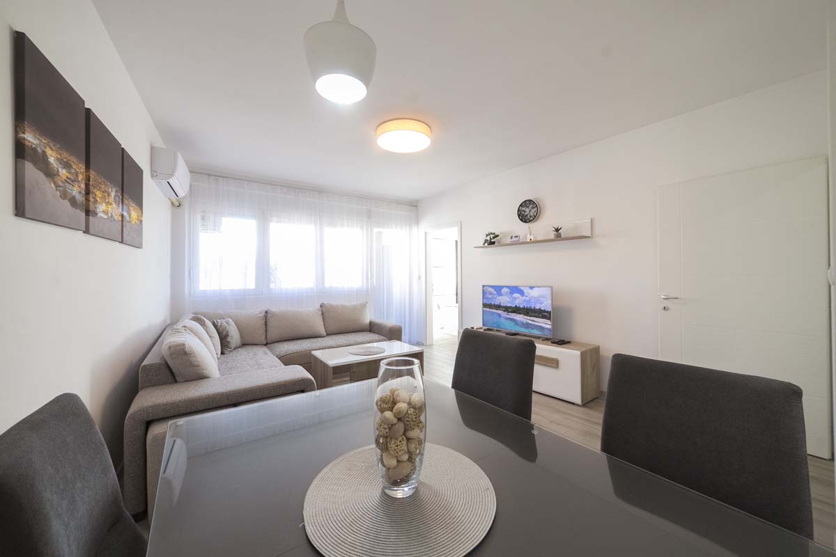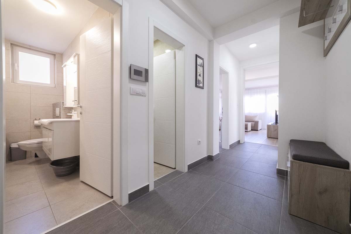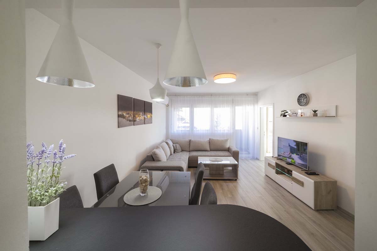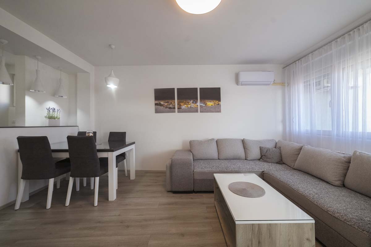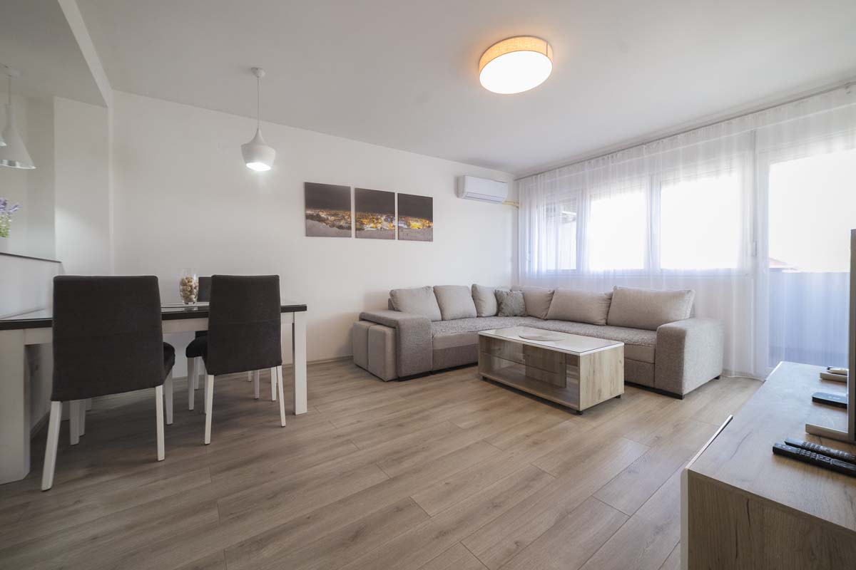 Apartment LUX 1 is located in a new residential building on the second floor, in the very center of Pirot, isolated from the city noise. The area of the apartment is 70m2, which makes it one of the more spacious and comfortable in Pirot. It includes a living room, a fully equipped kitchen for a longer stay, 2 separate bedrooms, a bathroom, a toilet and a terrace.